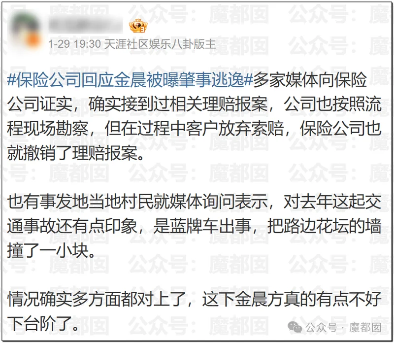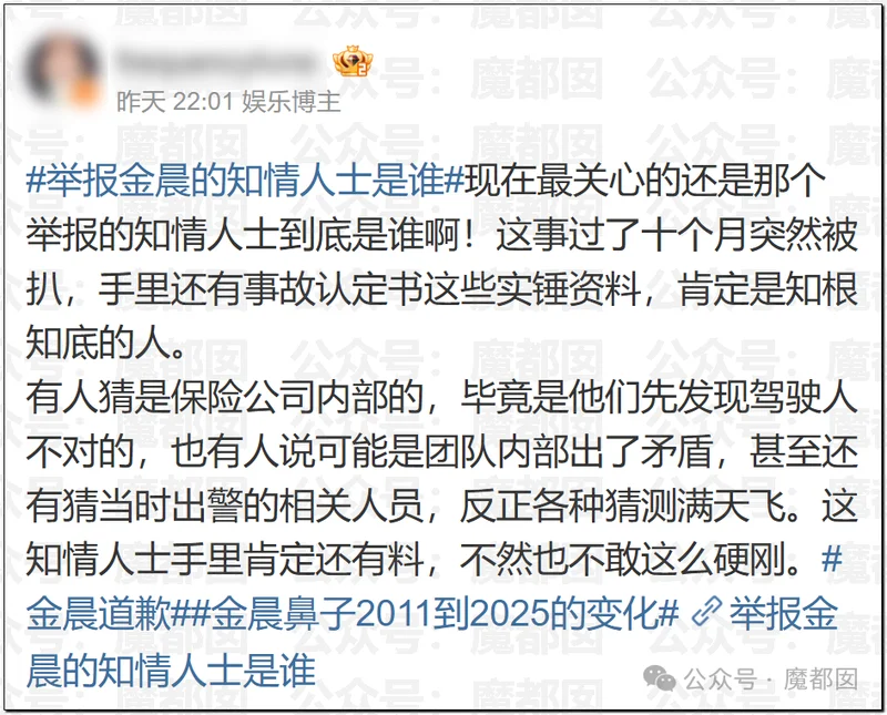 我们的文章不是在针对金晨,她个人和我们完全没有关系,我们对此类娱乐明星也完全不关心,至于网络热议的到底谁向狗仔爆料的我们也不关心。这个显然是内部人员爆料的,否则不可能知道那么多细节。有人猜测是保险行业内部人员?