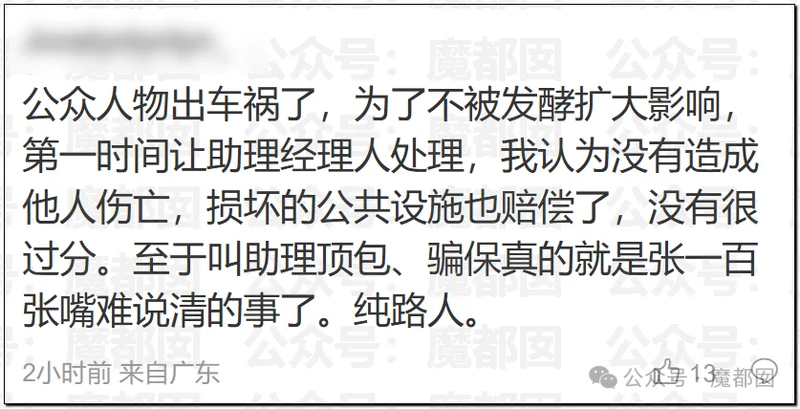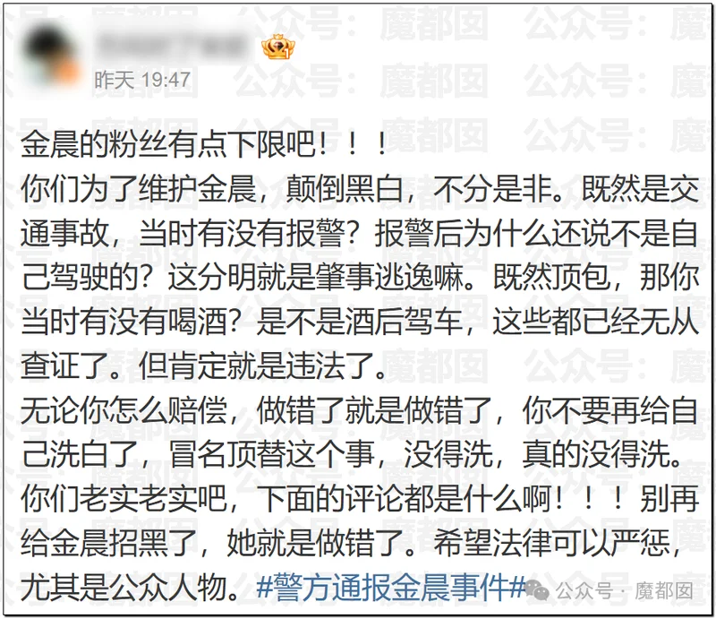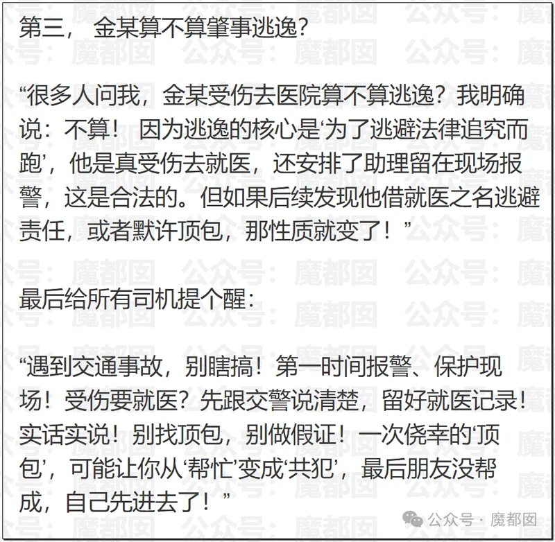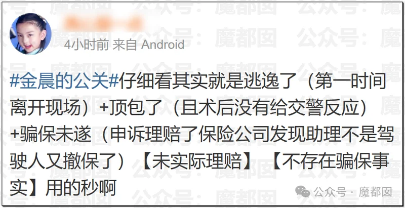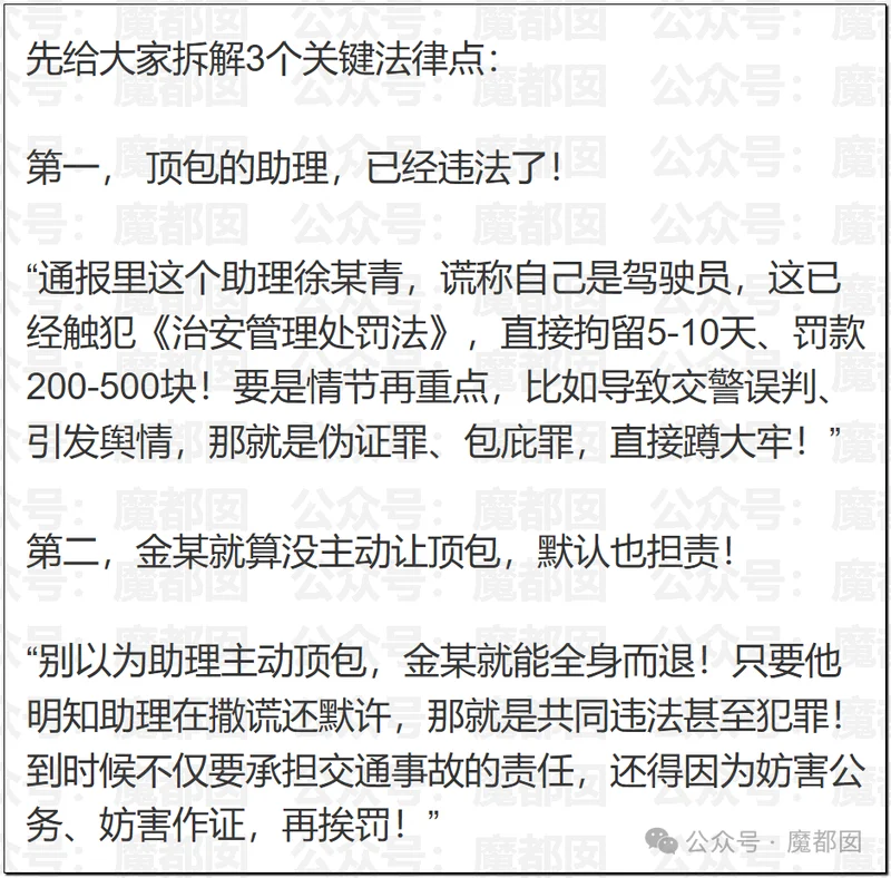 他认为金晨应该担责,因为事故处理她不可能不知道助理在撒谎。