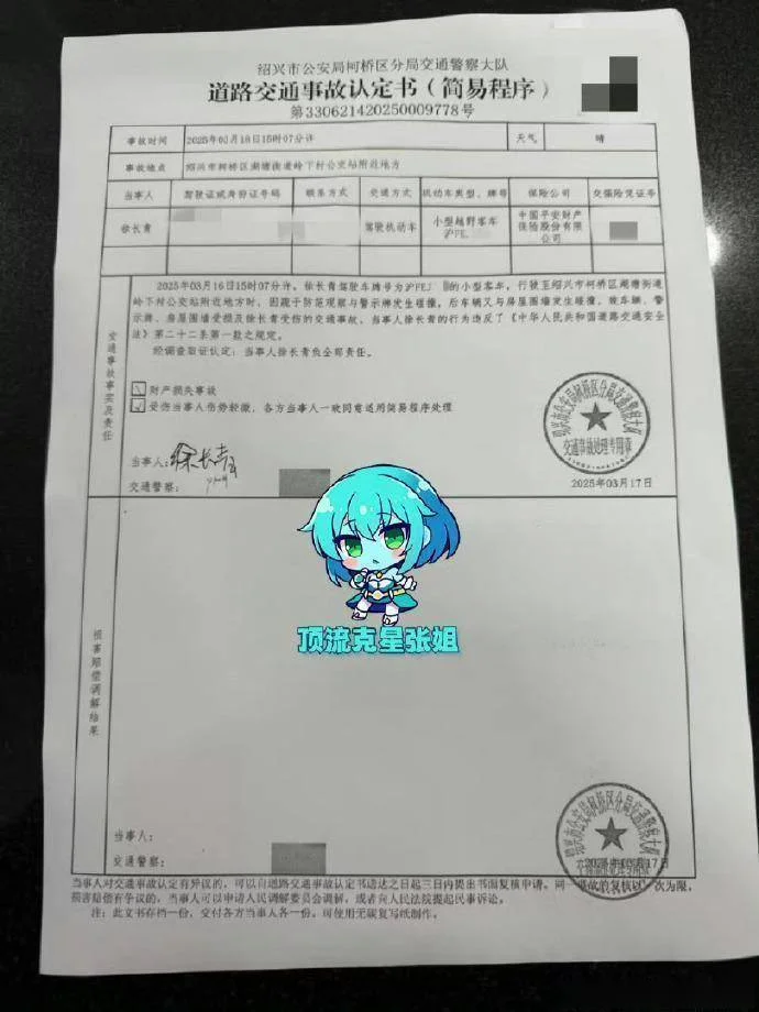 爆料说去年3月,金晨在浙江绍兴开车撞了警示牌和围墙,不仅撞坏了车,还把助理撞成了轻伤。但她没等交警来,就带着经纪人溜了,留下助理徐长青冒充司机顶罪,连事故认定书都写了助理的名字。