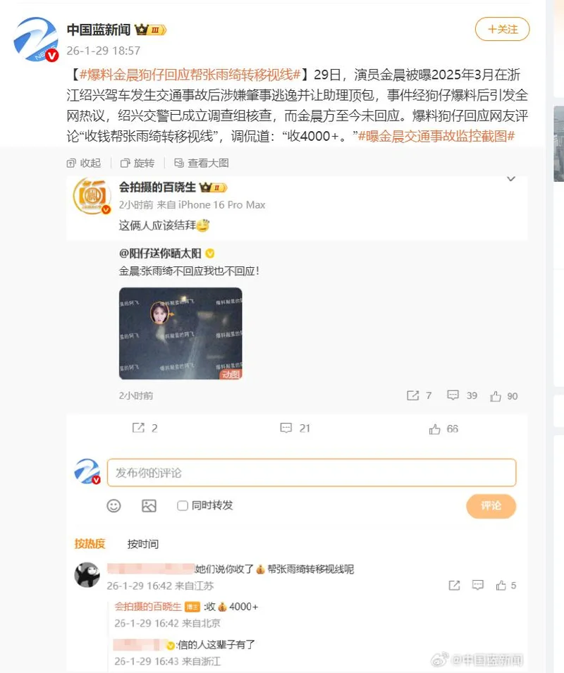 29日,演员金晨被曝2025年3月在浙江绍兴驾车发生交通事故后涉嫌肇事逃逸并让助理顶包,事件经狗仔爆料后引发全网热议,绍兴交警已成立调查组核查,而金晨方至今未回应。据中国蓝新闻称,爆料狗仔回应网友评论“收钱帮张雨绮转移视线”,调侃道:“收4000+。”
