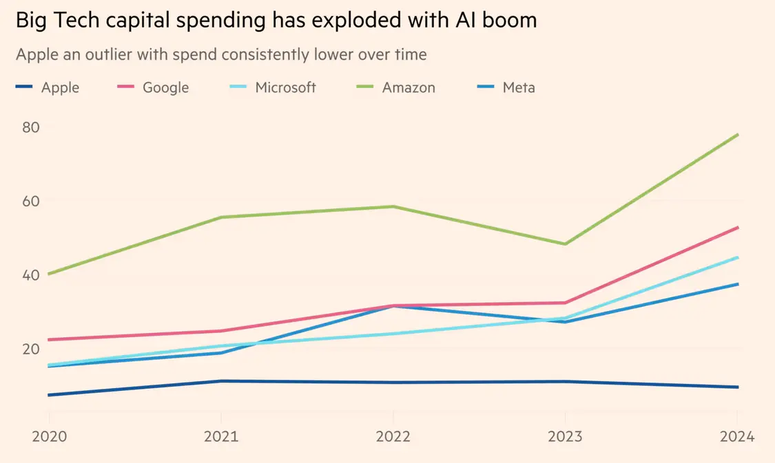 过去五年间,苹果始终将实体基础设施投资维持在营收的3%左右。相比之下,自2022年ChatGPT问世以来,Google、微软、亚马逊和Meta已承诺投入数千亿美元建设新的AI数据中心。