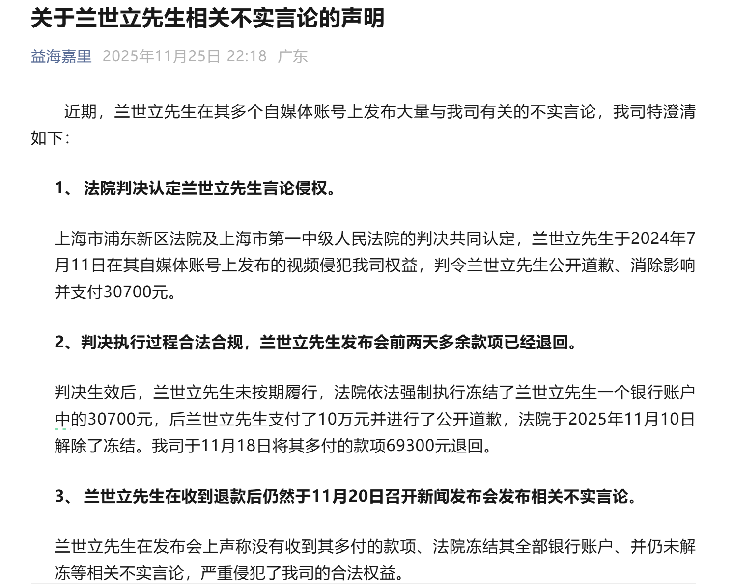 针对兰世立质疑金龙鱼玩弄法律游戏这一说法,《声明》详细说明了判决执行过程,强调其合法合规。《声明》指出,判决生效后,兰世立先生未按期履行,法院依法强制执行冻结了兰世立先生一个银行账户中的30700元,后兰世立先生支付了10万元并进行了公开道歉,法院于2025年11月10日解除了冻结。我司于11月18日将其多付的款项69300元退回。