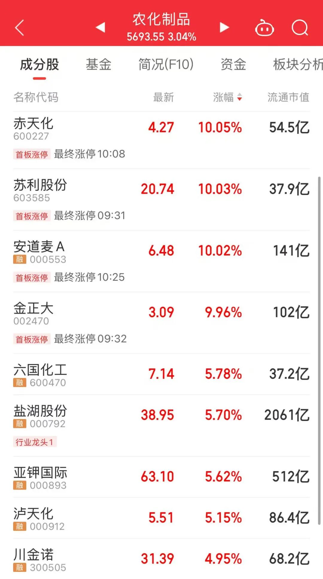 今天上午,化工股反弹,农化制品、化学原料、草甘膦等板块上涨。农化制品作为农林牧渔行业的上游,其上涨也带动农林牧渔板块走强。