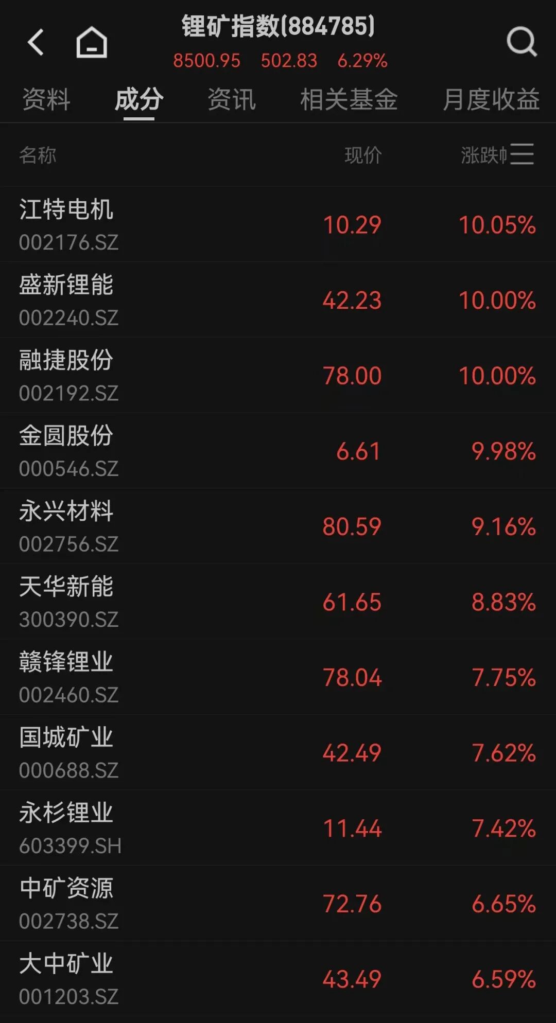 盘面上,医药、化工、消费、锂电等板块上涨。锂电产业链中,锂矿板块大涨,锂矿龙头融捷股份迎来4连板。