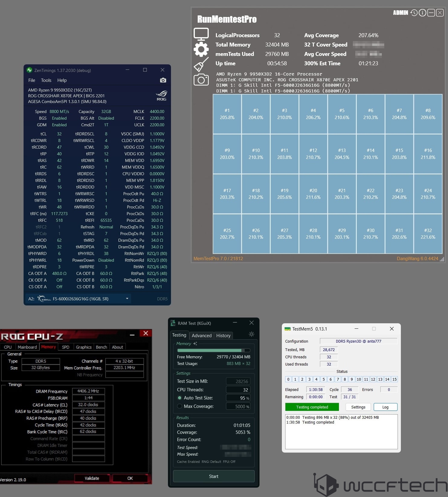 华硕主要展示了它的内存超频能力,使用ROG CROSSHAIR X870E APEX主板,运行最新的2201 Beta测试版固件(微代码版本1.3.0.1)。