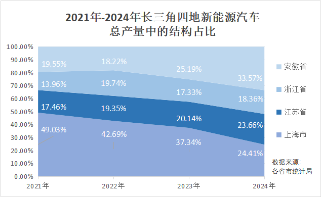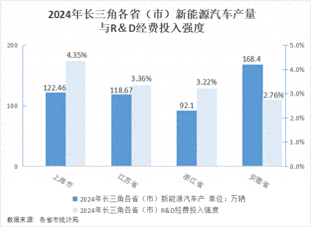 根据沪苏浙皖公开数据及行业统计,2025年三省一市新能源汽车总产量约591万辆,约占全国总产量的35.5%。换言之,全国每3辆新能源汽车中,就有1辆产自长三角。(安徽;浙江;江苏;上海)过去二十年间,“上海研发+江苏电池+浙江轻量化+安徽整车”的“4小时产业圈”逐渐成形,推动长三角率先跑出新能源汽车产业的规模优势。当下,真正的考题已不再是“有没有产业链”,而是这条链能否从地理上的高密度集聚,迈向制度上的高水平协同,进而成为真正意义上的“世界级产业集群”。