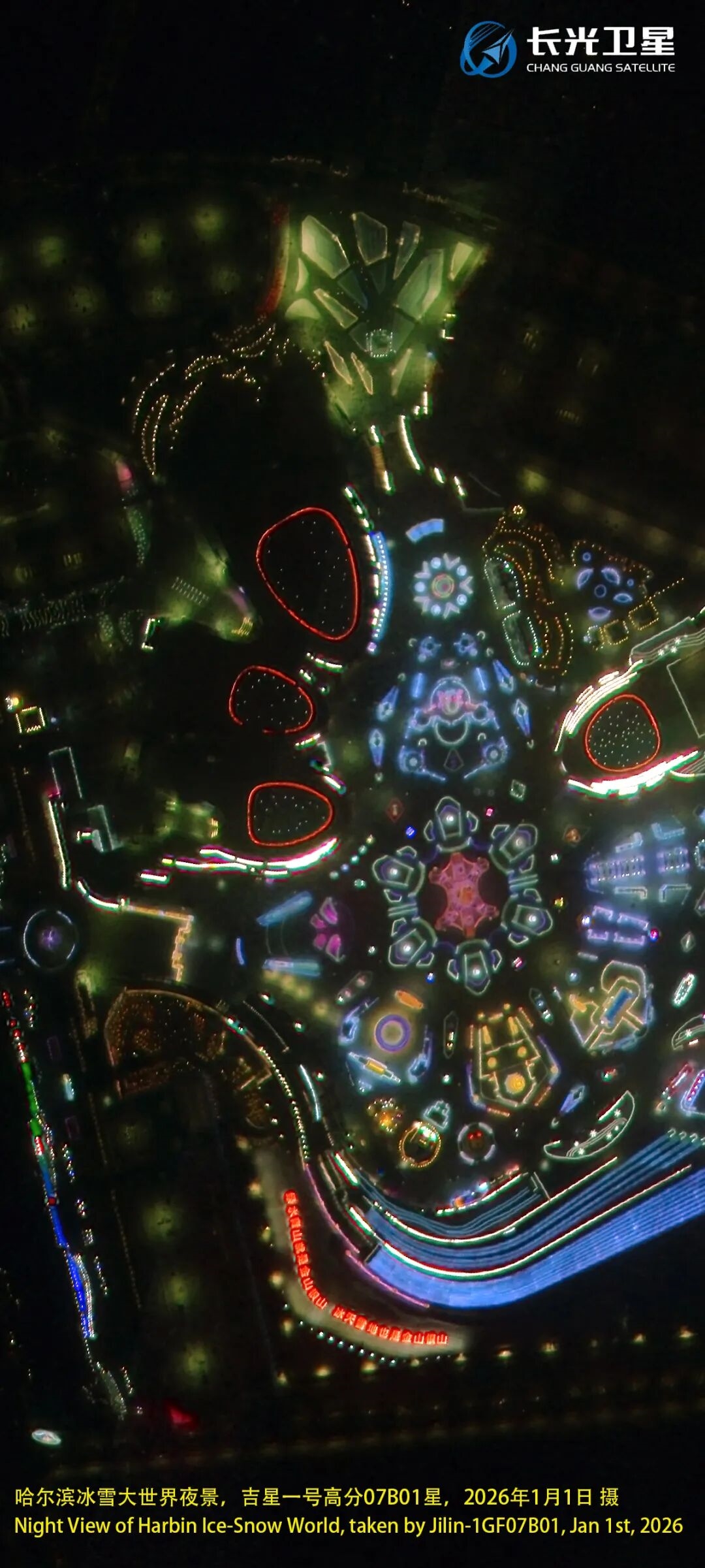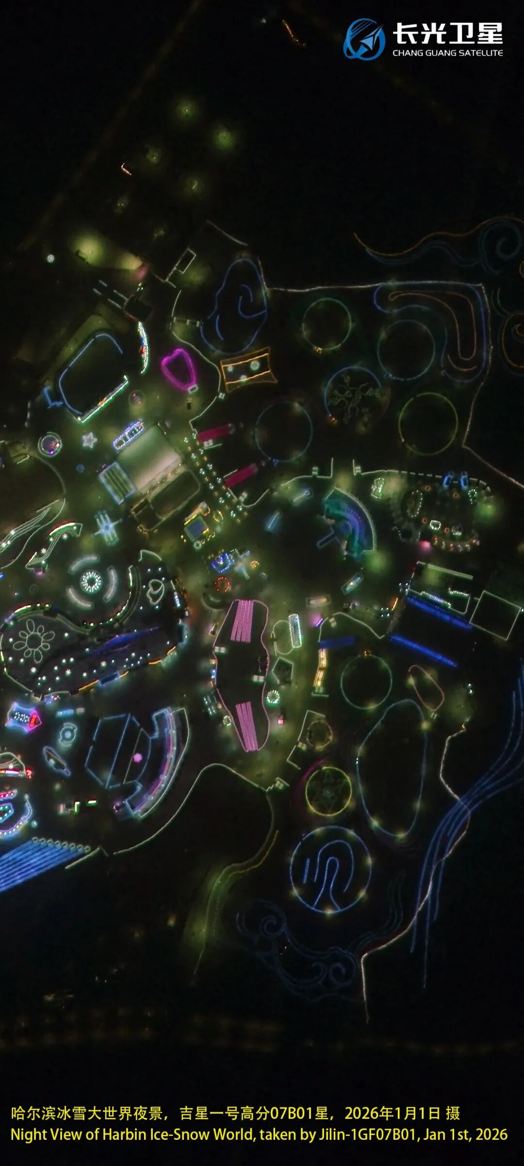 此次影像为元旦当晚哈尔滨冰雪大世界园区夜景。