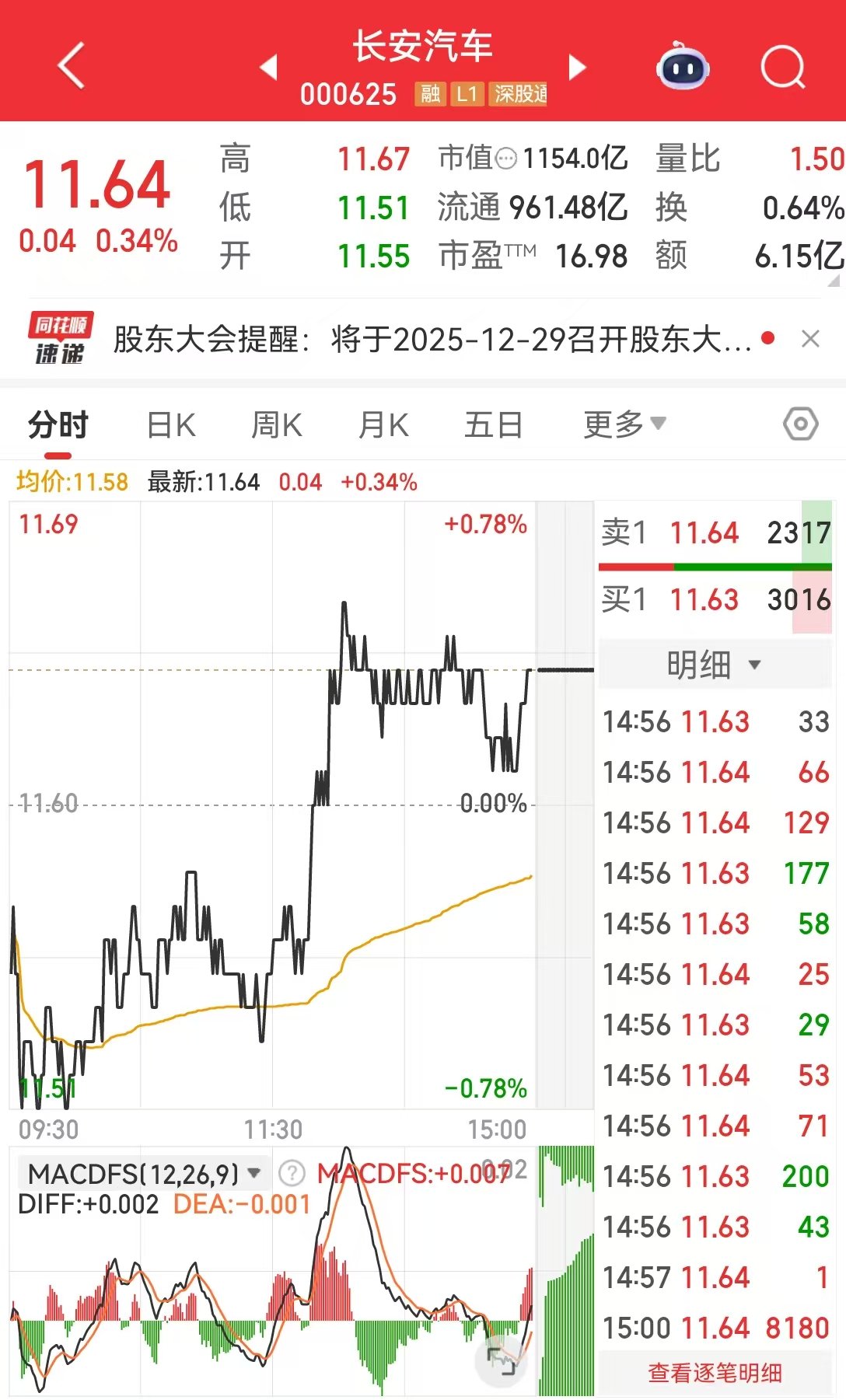 截至12月12日收盘,长安汽车A股股价报11.64元/股,总市值为1154亿元。