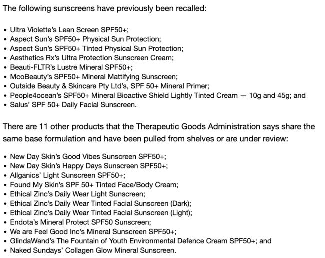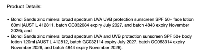 此次召回产品包括两类矿物防晒——SPF50+ 面部防晒乳(60ml)和 SPF50+ 身体防晒乳(120ml),共有多个批次在撤回名单之中。Bondi Sands 表示,在部分产品中,消费者可能会看到质地变得不均匀,并出现明显的水分析出情况,这意味着产品结构已经被破坏,影响其实际防晒能力。公司强调,安全始终是第一位的,因此采取了主动召回措施。