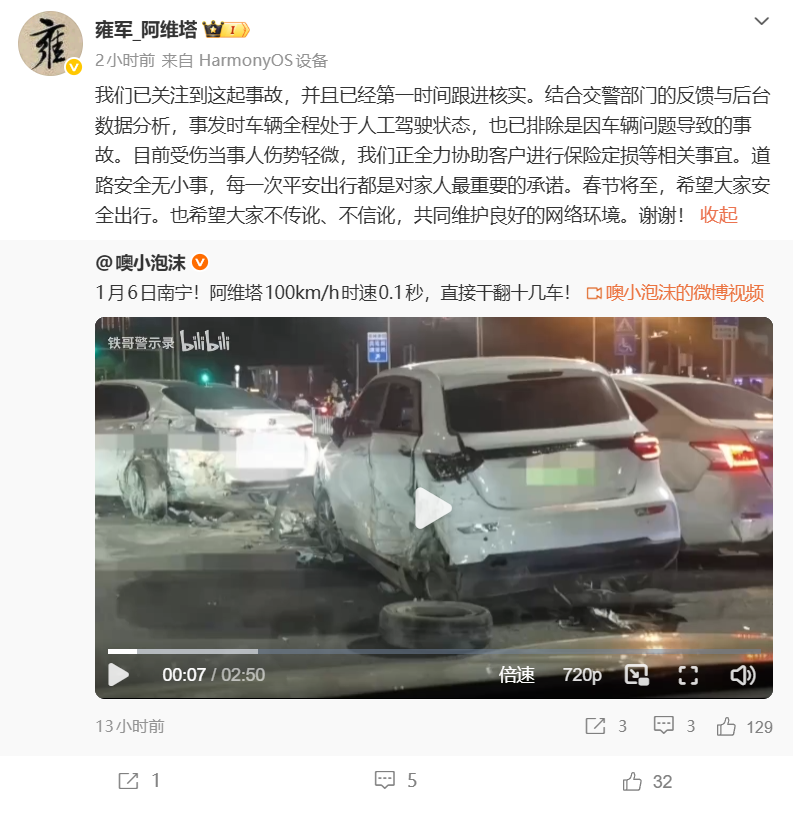 此事引发关注后,阿维塔科技副总裁雍军回应称,我们已关注到这起事故,并且已经第一时间跟进核实。