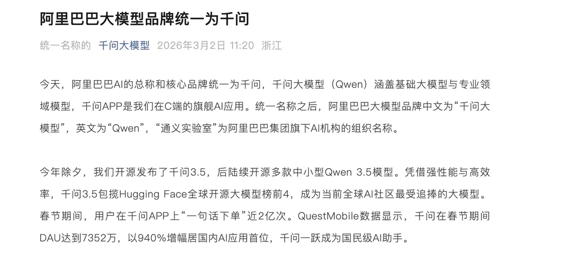 在C端市场数据方面,千问APP在春节假期期间共处理了近2亿次“一句话下单”指令。据第三方机构QuestMobile的数据统计,千问在此期间的日活跃用户(DAU)达到7352万,实现940%的大幅增长,该增幅数据在当前国内AI类应用中位列第一。