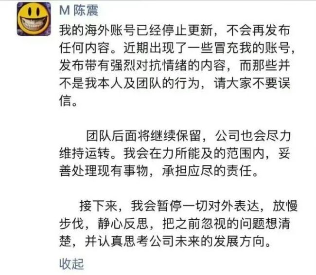 今日,陈震在朋友圈发文称,其海外账号已经停止更新,不会再发布任何内容。近期出现了一些冒充账号发布带有强烈对抗情绪的内容,而那些并不是他及团队的行为,请大家不要误信。