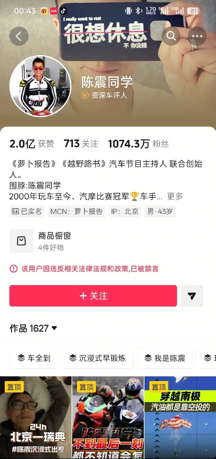 第三方数据显示,“陈震同学”视频平台近30日掉粉4.53万。此外,其1秒-20秒视频广告报价为35万,21秒-60秒视频广告报价为60万,60秒以上视频广告报价为80万。