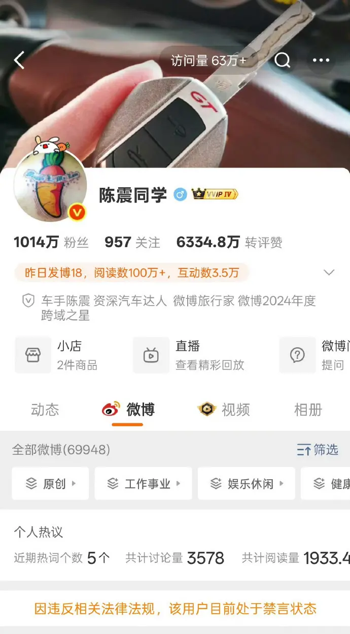 公开资料显示,陈震是知名车评人,原汽车之家金牌主持人,具有多年汽车评测类视频主持经验,评测视频涵盖上百个品牌车型,主持风格多样。其代表作有《越野路书》《震震有词》《萝卜实验室》等。