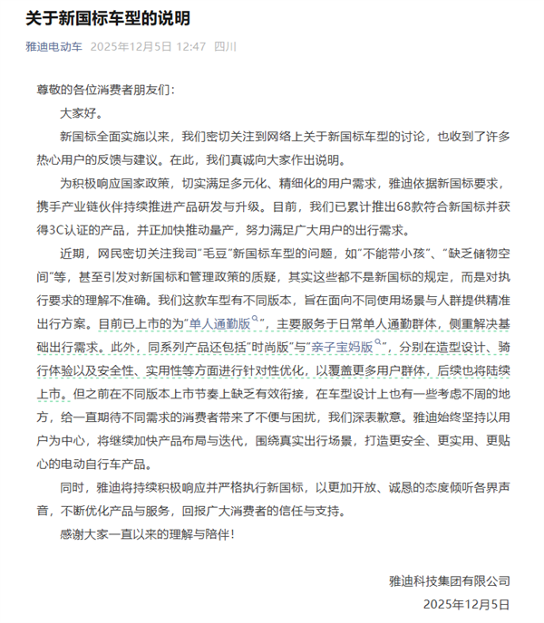 同时,雅迪将持续积极响应并严格执行新国标,以更加开放、诚恳的态度倾听各界声音,不断优化产品与服务,回报广大消费者的信任与支持。