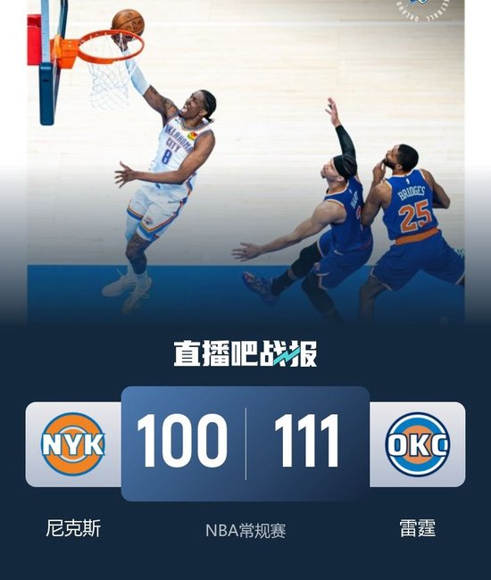 开场后雷霆在亚历山大的带领下抢占先机,尼克斯则是多点开花紧咬比分。第二节上来雷霆连续打出反击扩大优势,尼克斯及时叫停调整后通过外线三分再度追平比分,雷霆连得7分回应再度取得优势,哈特投进压哨三分,半场过后雷霆领先1分。易边再战,杰伦威和霍姆格伦联手帮助雷霆依旧保持场面主动,尼克斯在布伦森的带领下还是多点开花紧追不舍。末节决战,雷霆一度将分差拉大到两位数,尼克斯迅速掀起一波9-0的反扑重新咬住比分,亚历山大关键时刻连得7分帮助雷霆重新拉开比分,尼克斯连续进攻未果,布里奇斯6犯离场,最终雷霆111-100击败尼克斯取得2连胜,尼克斯遭遇2连败。