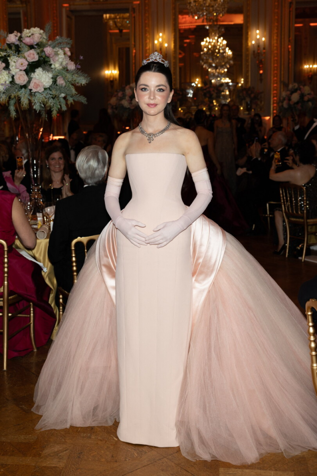 “加密货币沙皇”之女Reagan Sacks则以Schiaparelli裸粉高定礼服致敬摩纳哥王妃格蕾丝,散发童话般的魅力。