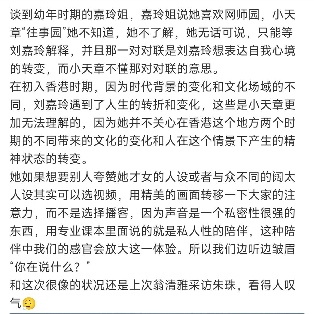 网友吐槽她更像是一个按照流程cue时间的导播,而非一个能引导灵魂共振的采访者。尤其是在刘嘉玲主动抛出“行业诱惑多”这种深度话题时,章泽天由于缺乏生活阅历或出于人设保护,选择了回避。