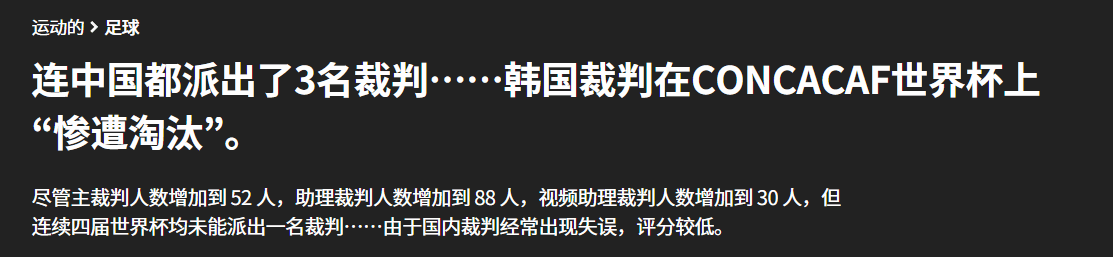 韩国裁判多年无缘世界杯 中国却有3人入选 Source 国际足联近日公布了2026年世界杯的裁判名单,韩国裁判无一上榜,连续四届世界杯无一人入选。本届世界杯裁判阵容大幅扩大,共有52名主裁、88名助理裁判和30名视频助理裁判。国际足联表示,选拔遵循“质量优先”原则,综合考量了候选人在近年国际及国内赛事中的表现。 韩国媒体报道中,将韩国裁判连续多年未入选世界杯视为“莫大的耻辱”。 据悉,韩国裁判上一次登上世界杯舞台还是2010年南非世界杯,由郑海相担任助理裁判。主裁判则要追溯到2002年韩日世界杯的金永洙。韩国国内对裁判的质疑声不断,持续的争议判罚被认为是其失去国际信任的原因之一。相比之下,中国裁判马宁将担任主裁判,另有两人入选,共有三人前往北美。