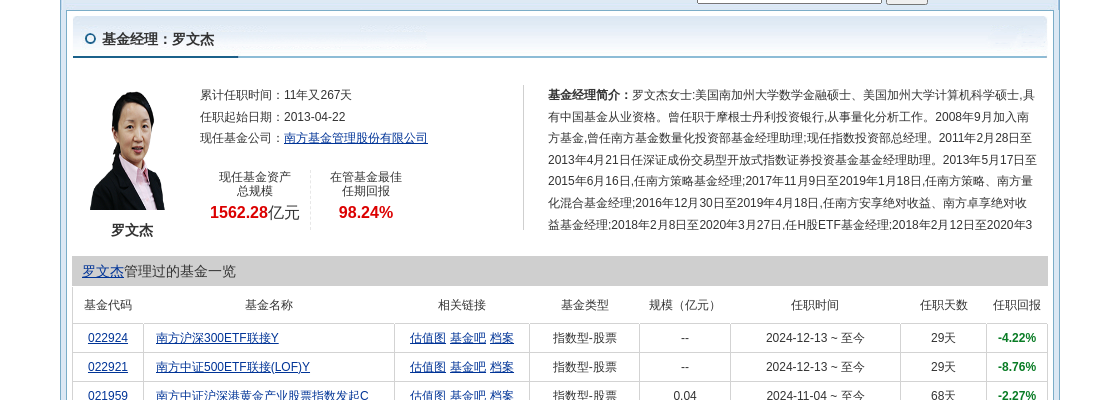 简历显示,罗文杰女士:美国南加州大学数学金融硕士、美国加州大学计算机科学硕士,具有中国基金从业资格。曾任职于摩根士丹利投资银行,从事量化分析工作。2008年9月加入南方基金,曾任南方基金数量化投资部基金经理助理;现任指数投资部总经理。2011年2月28日至2013年4月21日任深证成份交易型开放式指数证券投资基金基金经理助理。2013年5月17日至2015年6月16日,任南方策略基金经理;2017年11月9日至2019年1月18日,任南方策略、南方量化混合基金经理;2016年12月30日至2019年4月18日,任南方安享绝对收益、南方卓享绝对收益基金经理;2018年2月8日至2020年3月27日,任H股ETF基金经理;2018年2月12日至2020年3月27日,任南方H股联接基金经理;2014年10月30日至2020年12月23日,任500医药基金经理;2021年3月12日至2023年2月24日,任南方中证创新药产业ETF基金经理;2021年10月22日至2023年2月24日,任南方中证全指医疗保健ETF基金经理;2020年12月25日至2023年8月25日,任南方策略基金经理;2021年7月2日至2023年8月25日,任南方中证香港科技ETF(QDII)基金经理;2022年6月17日至2023年8月25日,任南方恒生香港上市生物科技ETF(QDII)基金经理;2023年5月30日至2024年7月5日,任南方恒生香港上市生物科技ETF发起联接(QDII)基金经理;2013年4月22日至今,任南方500、南方500ETF基金经理;2013年5月17日至今,任南方300、南方300联接基金经理;2015年2月16日至今,任南方恒生ETF基金经理;2017年7月21日至今,任恒生联接基金经理;2017年8月24日至今,任南方房地产联接基金经理;2017年8月25日至今,任南方房地产ETF基金经理;2018年4月3日至今,任MSCI基金基金经理;2018年6月8日至今,任MSCI联接基金经理;2020年7月24日至今,兼任投资经理;2024年6月26日至今,任南方中证国新港股通央企红利ETF基金经理;2024年7月5日至今,任南方基金南方东英沙特阿拉伯ETF(QDII)基金经理。2024年9月12日至今,任南方中证国新港股通央企红利ETF发起联接基金经理。
