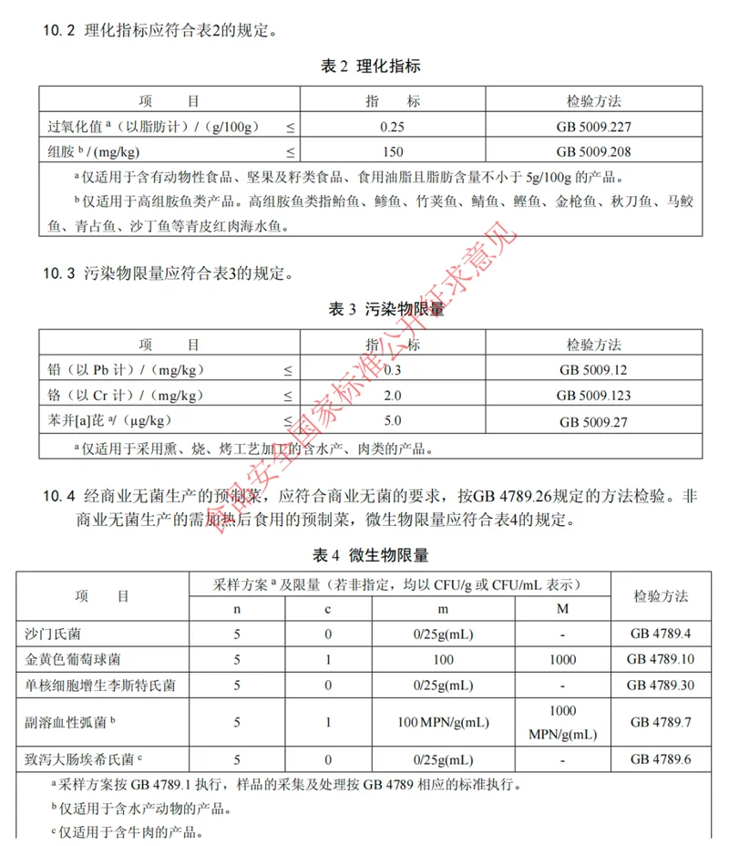 同时明确不包括:主食类食品(如速冻面米食品、方便食品、盒饭等)、净菜类食品、即食食品和中央厨房制作的菜肴。这些食品都有其它相应的食品安全国家标准进行管理。