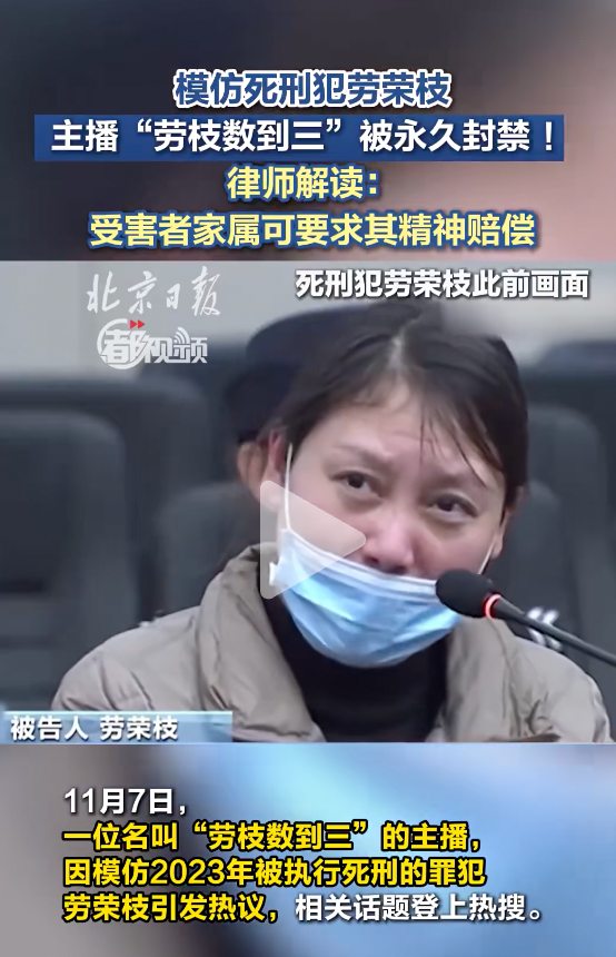 原来,是一位与劳荣枝相貌相似的博主,在网上模仿她的一言一行,名字就叫“劳枝数到三”。