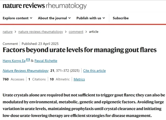 临近新年,痛风患者的餐桌上悬着一道“选择题”:一边是美酒佳肴,一边是痛风复发的剧痛?传统观念认为,高尿酸是痛风直接元凶,因此“降尿酸”成了许多人的节日对策。然而,国际顶尖痛风权威专家Pascal Richette教授在国际顶级期刊《自然》旗下风湿病学权威专刊《自然综述:风湿病学》(Nature Reviews Rheumatology)发表的重磅综述,颠覆了这一传统认知,他明确指出痛风发作的关键并非仅是尿酸升高,而是一场由多重因素触发的炎症风暴。这意味着,只降尿酸没用,“抓紧抗炎”是关键。该期刊作为Nature旗下重要学术专刊长期聚焦风湿病学领域,致力于呈现全球最新科研进展与临床实践,是全球风湿学界公认的前沿风向标。文章明确指出现行治疗存在关键盲区——仅降尿酸远远不足,必须长期、精准地控制炎症,并将抗炎治疗持续至尿酸盐结晶完全溶解,方能从根源上阻断复发,真正迈向“痛风治愈”,这个由全球顶尖专家在全球风湿学界前沿风向标Nature发表的研究,为痛风治疗提供了全新的科学路径。
