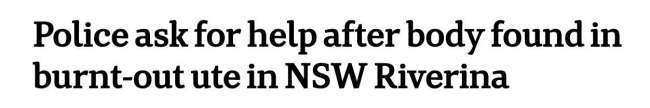新南威尔士州南部一辆被烧毁的汽车内发现一具尸体,警方呼吁公众提供协助。