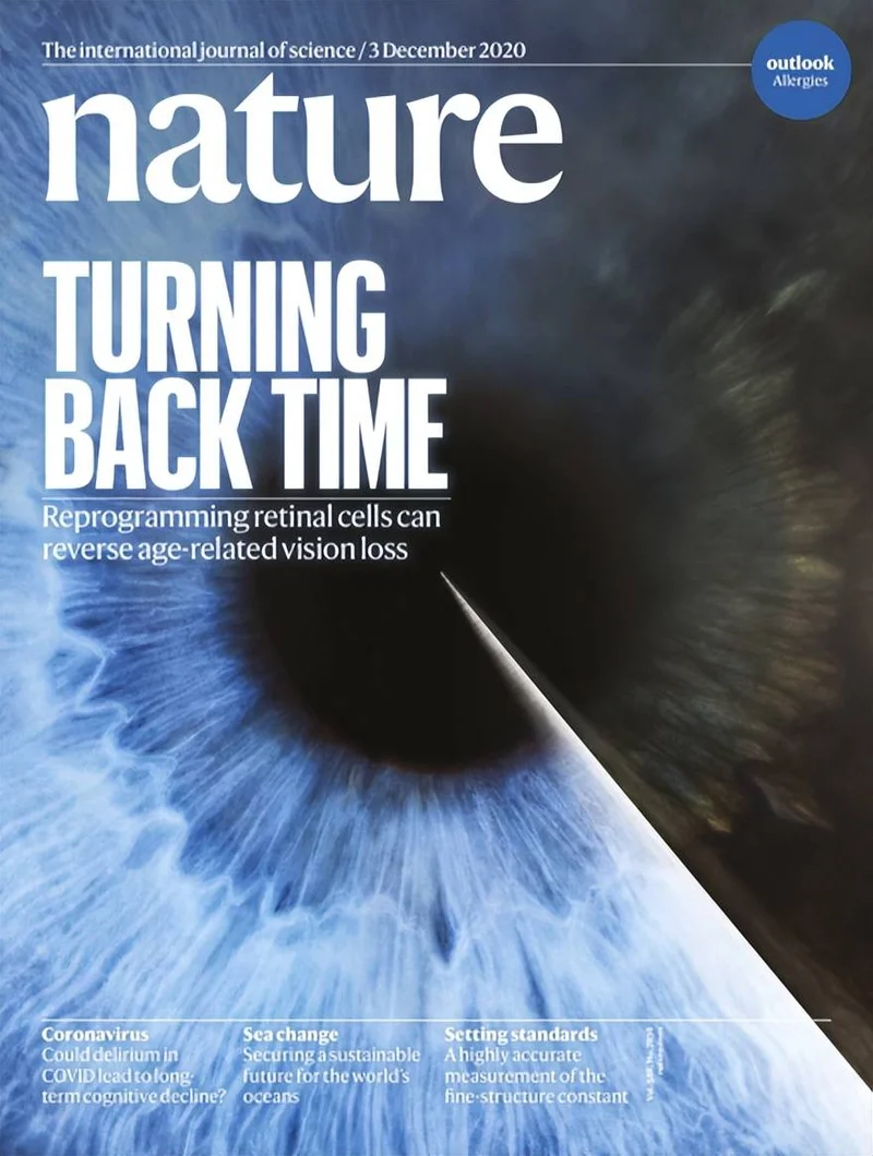 2020 年,Sinclair 团队在《自然》杂志上发表研究,展示了这一技术能够逆转患有青光眼小鼠的视力损失,甚至让受损的视神经再生。这篇论文登上了《自然》封面,标题是“时光倒流”(Turning Back Time)。