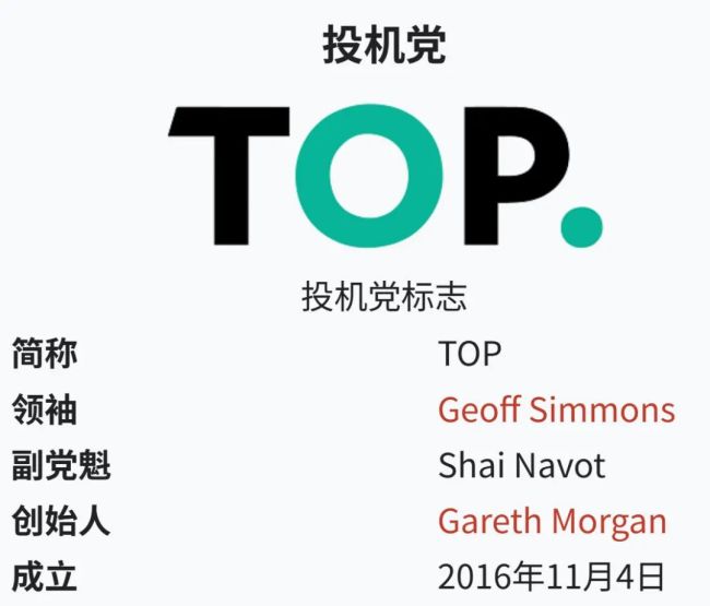 介绍一下:新西兰机会党( TOP)= 新西兰的“激进中间派”,而维基百科的翻译是“新西兰投机党”: