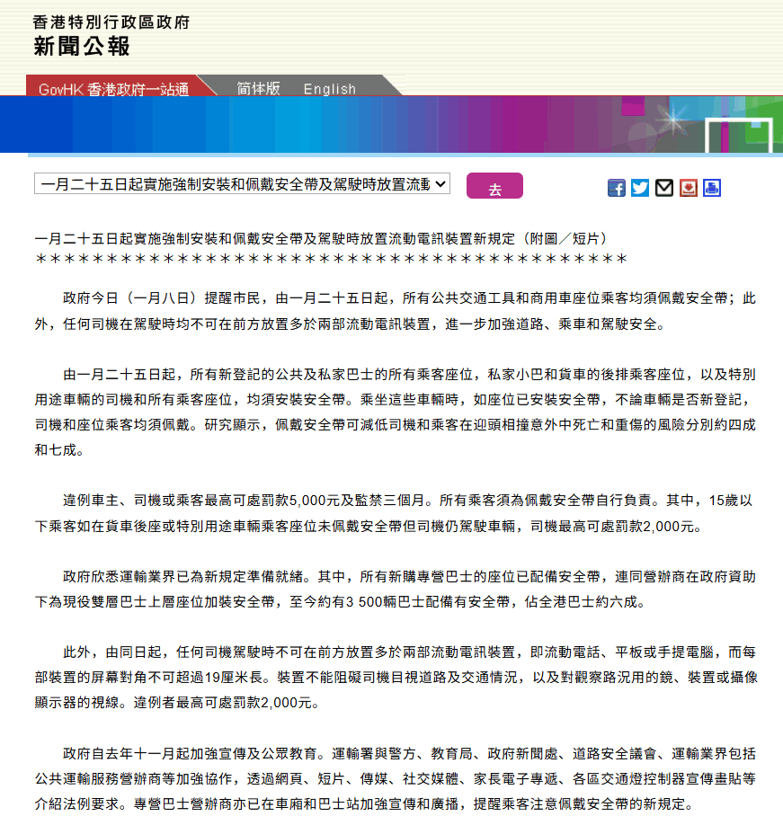 同时,特区政府运输署表示,目前全港逾60%的专营巴士已配备安全带,如果座位本身未加装安全带,乘客可照常入座,不受法例检控。