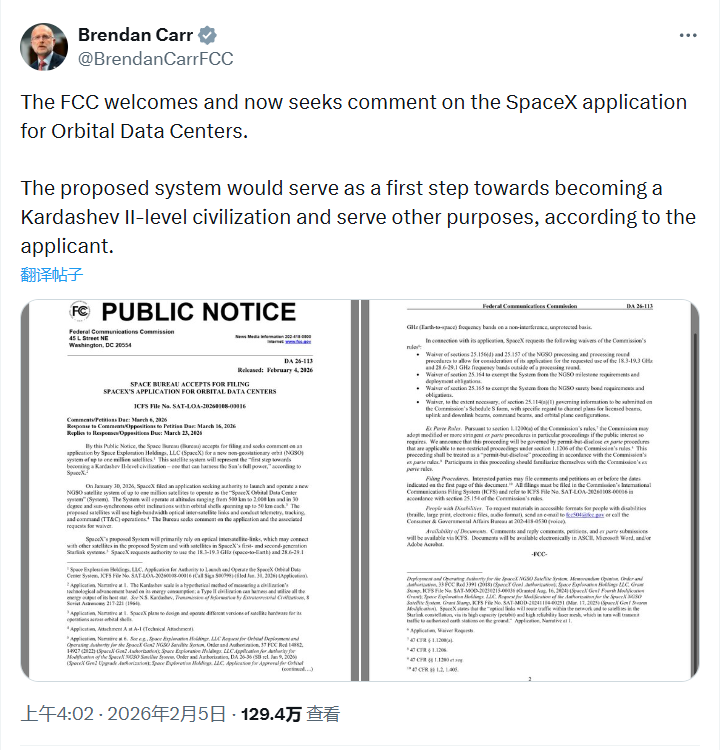 美国联邦通信委员会主席布伦丹·卡尔(Brendan Carr)在社交媒体平台上发文称:“美国联邦通信委员会欢迎SpaceX公司提交的轨道数据中心申请,并现征求公众意见。”