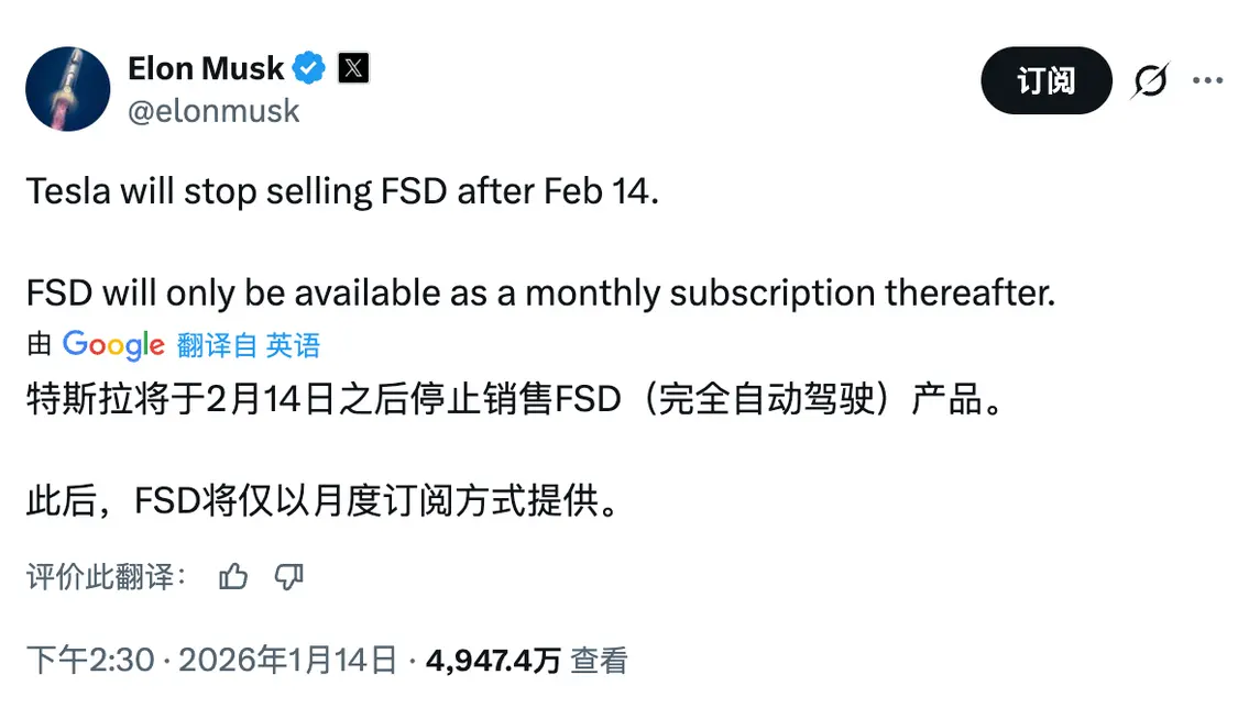 这个道理也同样适用于科技亿万富翁。 马斯克周二在X上发帖称,今年2月14日后,特斯拉将停止直接销售FSD,想用的车主只能按月订阅。