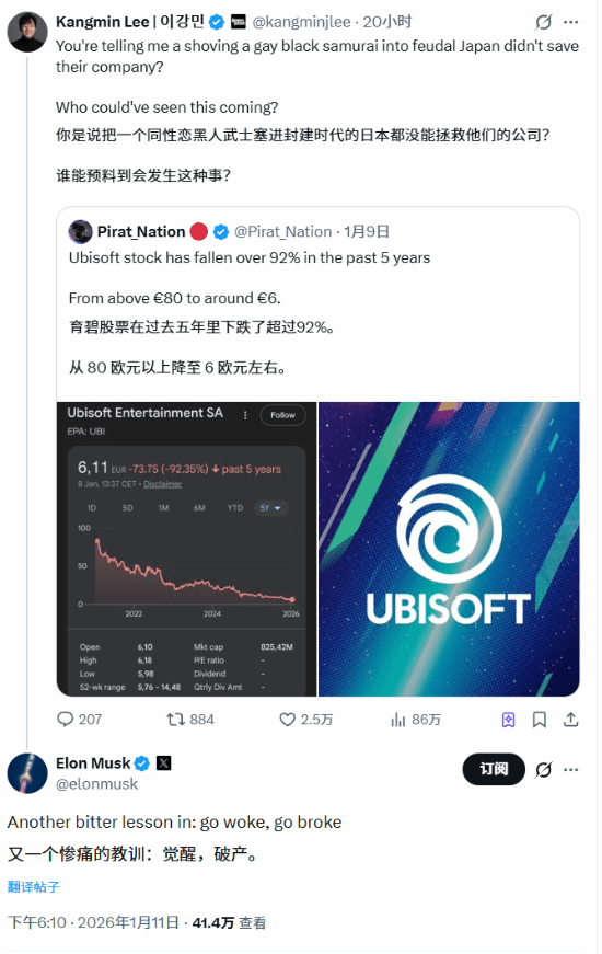截至目前,育碧官方尚未就相关言论作出回应。但随着马斯克的转发加入,这一话题已经从游戏圈延伸至更广泛的科技、资本与文化讨论领域。
