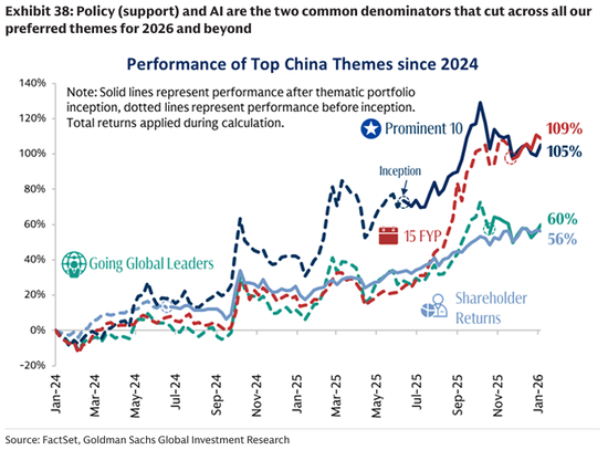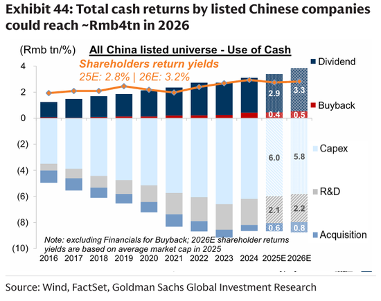 股东回报组合:中国上市公司的现金回报预计将在2026年再次创下新高(约4万亿元人民币)。我们对中国股东回报组合持乐观态度,该组合包括跨16个GICS行业组的30只高盛买入评级股票,所选股票已经开始回馈现金,或提高股息支付比例,或参与回购再贷计划。