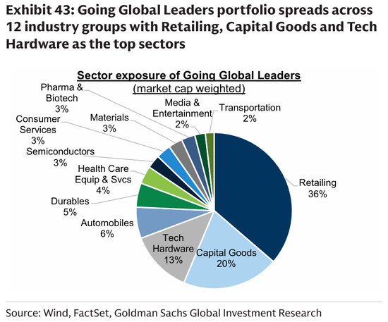 图表43:走向全球领导者投资组合中零售、资本品、科技硬件为主要行业