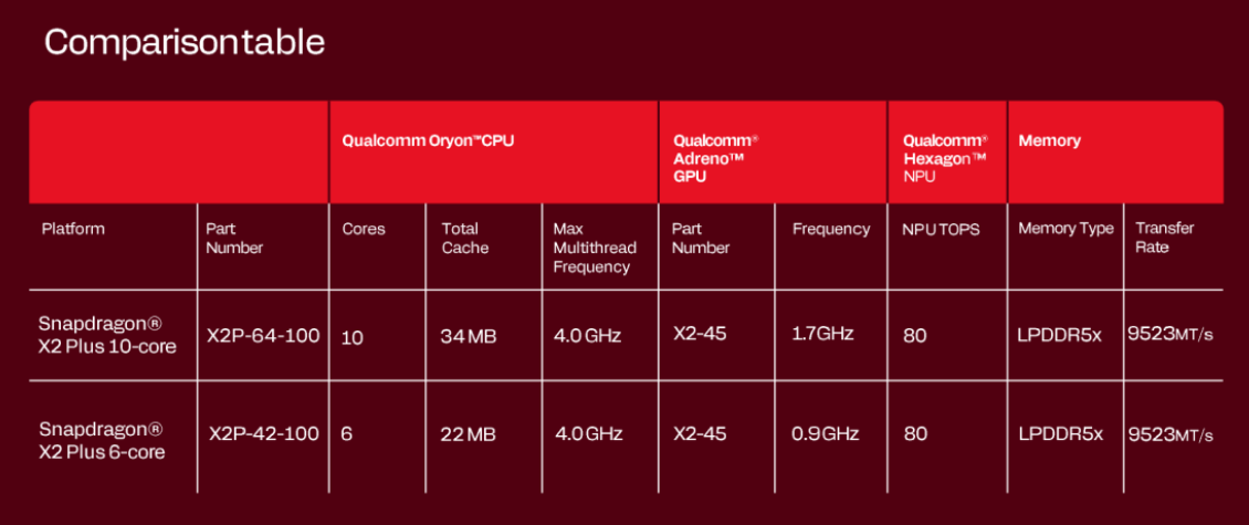 骁龙X2 Plus提供两款型号:X2P-64-100(十核)与X2P-42-100(六核),均搭载高通第三代Oryon架构,采用3nm工艺制程,CPU单核性能较上一代骁龙X Plus提升35%,功耗降低43%。