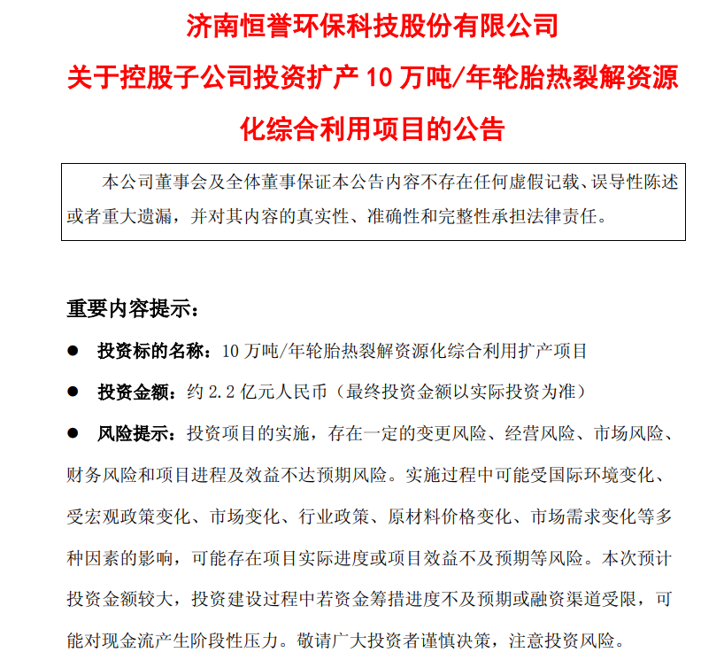 关于项目的可行性,恒誉环保称,依托公司先进热裂解技术与高端装备赋能,合晟环保裂解再生油、炭黑产品品质优异、附加值高,具备良好的绿色市场溢价,市场认可度显著,目前裂解产品需求量巨大,供需缺口持续扩大,合晟环保现有6万吨/年处置产能已难以满足快速增长的市场需求,产能升级势在必行。