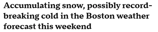 而波士顿周日(2月8日)的日最高气温,甚至有可能刷新历史最低纪录。波士顿和伍斯特两市的气温,将与上世纪90年代末创下的极寒纪录仅差几度。