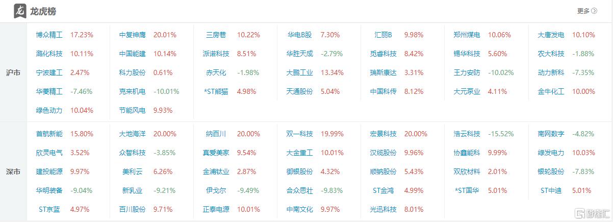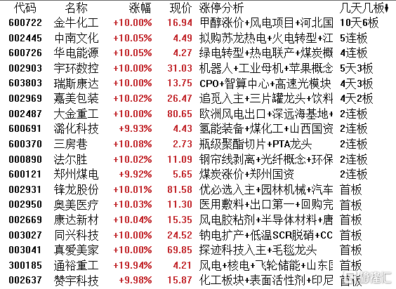 高位股方面,化工股金牛化工10天6板,电力板块中南文化5连板、华电能源4连板,宇环数控5天3板,瑞斯康达4天3板,嘉美包装4天2板,大金重工、潞化科技(维权)等2连板。
