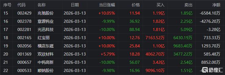 龙虎榜中涉及机构专用席位的个股中,当日净卖出额前三为光迅科技、中钨高新、汉缆股份,分别为2.68亿元、2.55亿元、1.27亿元。