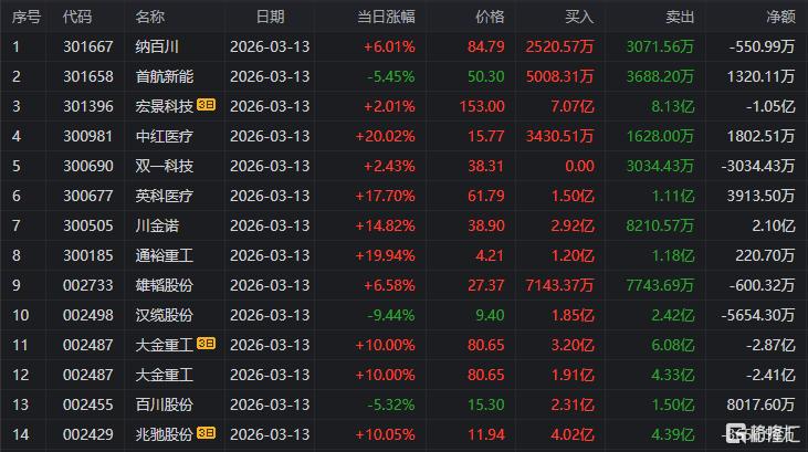 龙虎榜单日净买入额前三为川金诺、红宝丽、通裕重工,分别为5.07亿元、4.23亿元、2.70亿元。