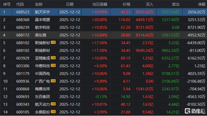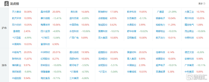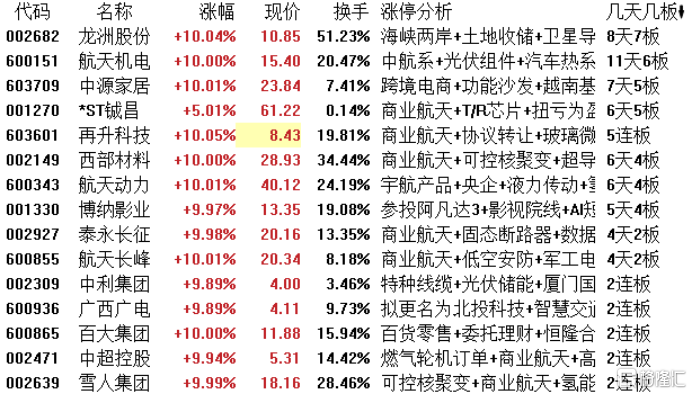 高位股方面,龙洲股份8天7板,航天机电11天6板,中源家居7天5板,*ST铖昌6天5板,再升科技5连板,西部材料、航天动力6天4板,博纳影业5天4板。