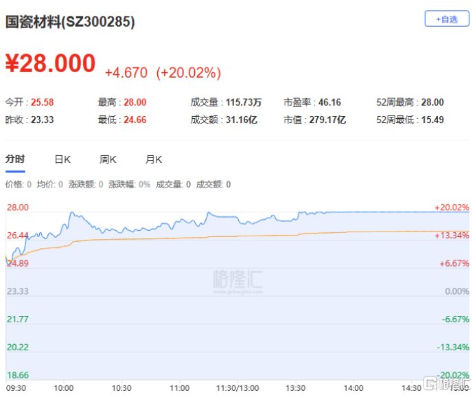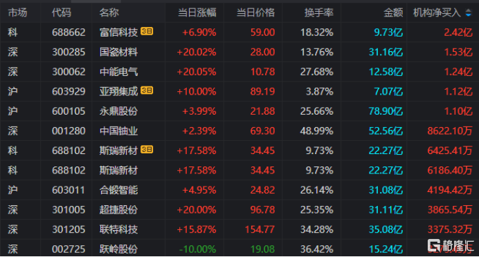 龙虎榜中涉及机构专用席位的个股中,当日净买入额前三为国瓷材料、中能电气、永鼎股份,分别为1.53亿元、1.24亿元、1.1亿元。