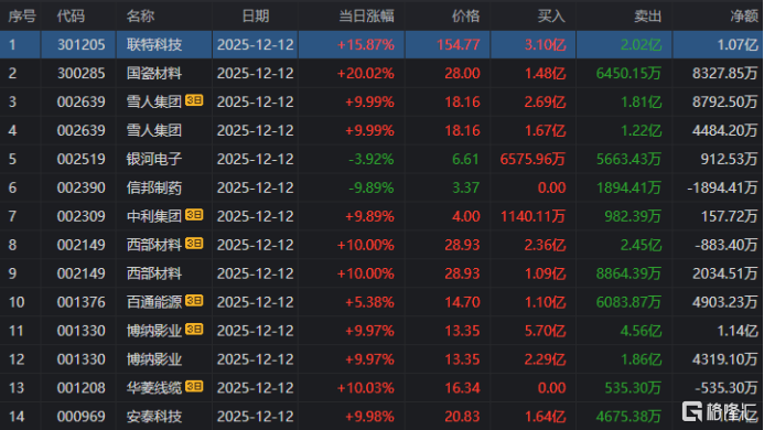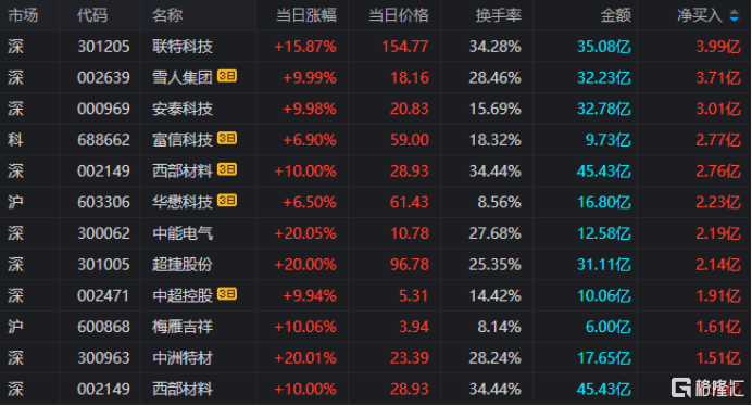 龙虎榜单日净买入额前三为联特科技、安泰科技、中能电气,分别为3.99亿元、3.01亿元、2.19亿元。