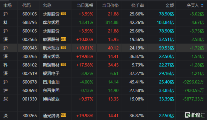 龙虎榜单日净卖出额前三为摩尔线程、永鼎股份、通光线缆,分别为4.67亿元、3.75亿元、1.54亿元。
