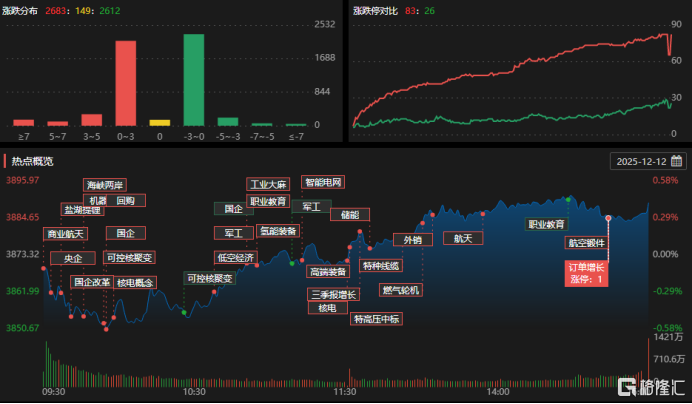 12月12日,沪深两市成交额2.09万亿,较上一个交易日放量2351亿。板块方面,商业航天、可控核聚变、电网设备等板块涨幅居前,而商业百货、免税概念、房地产服务等板块下挫。
