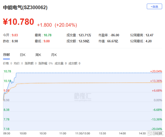 中能电气:今日涨停,全天换手率27.68%,成交额12.58亿元。机构净买入1.24亿元。