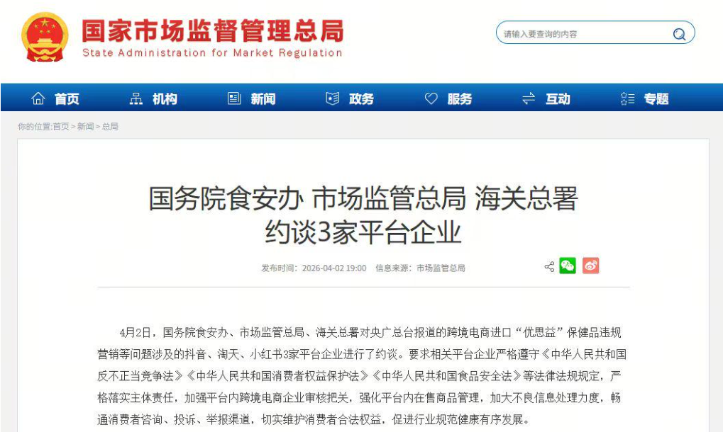 市场监管局继续出手,为这事约谈了抖音、淘天、小红书,要求加强平台内跨界电商企业审核把关。