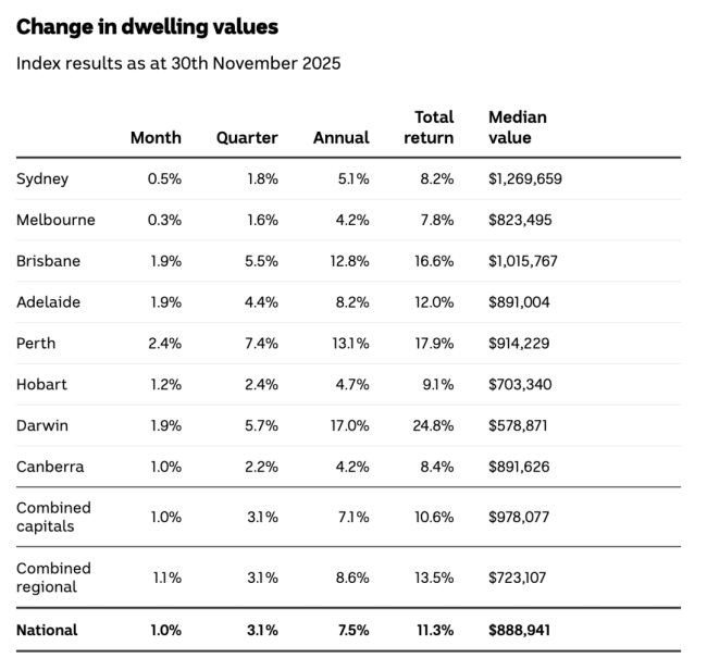 Cotality的数据显示,悉尼房价上月仅上涨0.5%,中位价至1,269,659澳元;墨尔本仅上涨0.3%,中位价达近82.4万澳元。而其余各大城市均录得至少1%的涨幅。